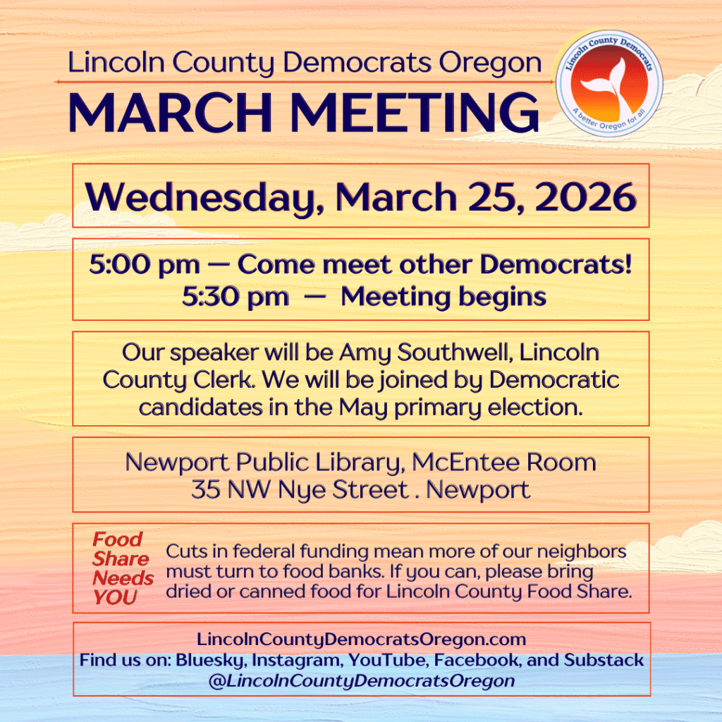 Join Lincoln County Democrats at our monthly meeting on March 25 at the Newport Public Library, McEntee Room. Our special guest speaker will be Lincoln County Clerk Amy Southwell, and we will be joined by other democrats running for office on the May ballot.