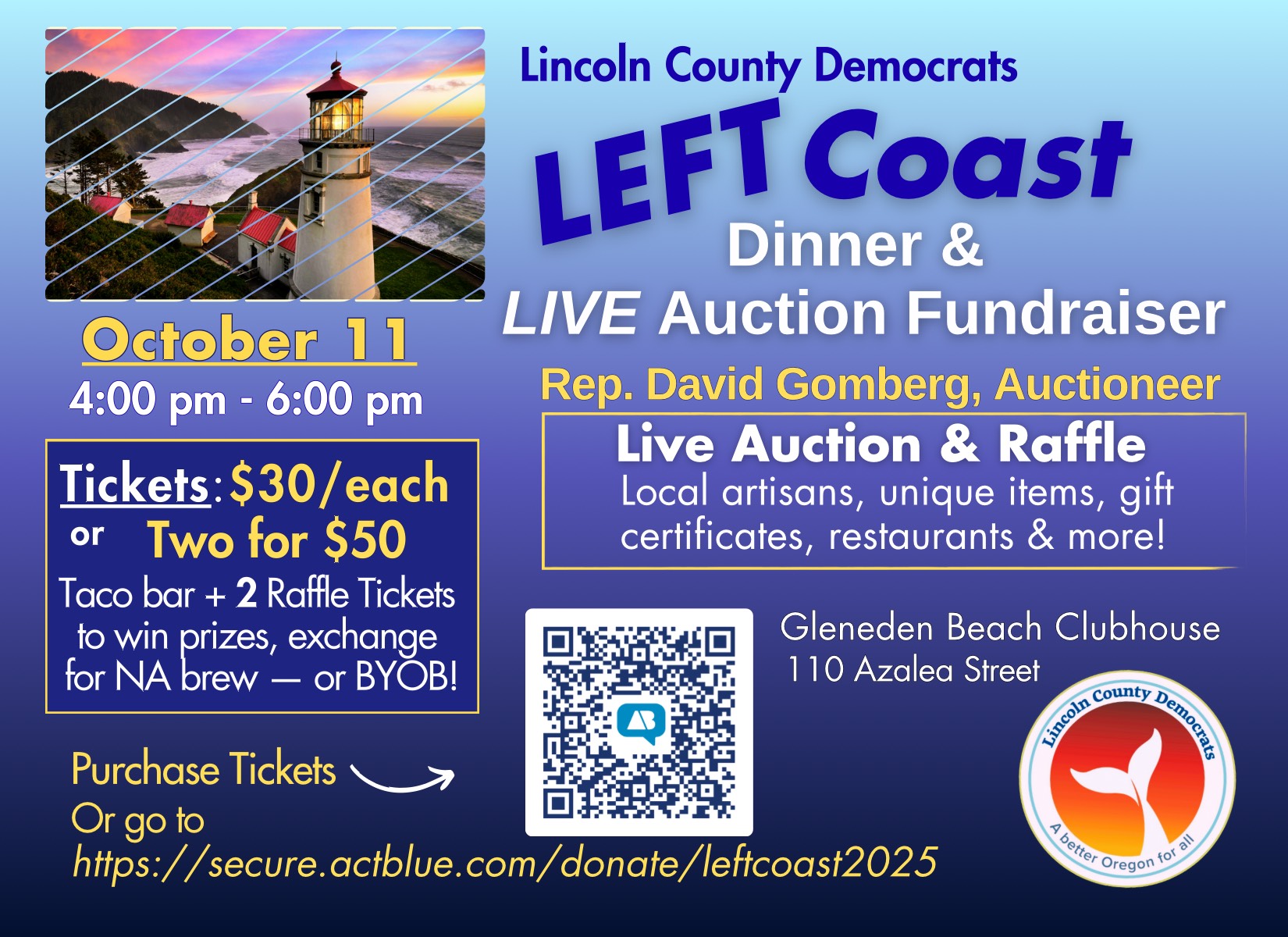 Enjoy good food and catching up with like-minded friends, and take a chance to bid on exciting prizes during the Live Auction with Representative David Gomberg as our auctioneer. Or use your raffle tickets to win prizes.