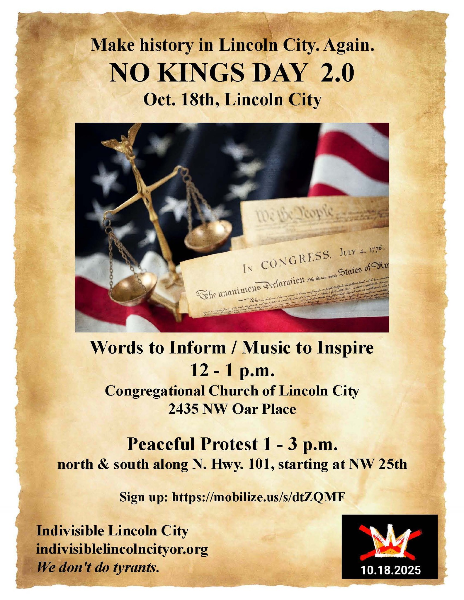 Join us for “Words to Inform & Songs to Inspire” from 12-1 pm at Congregational Church Sanctuary, then walk up NW 25th for the protest rally along N. Hwy. 101.