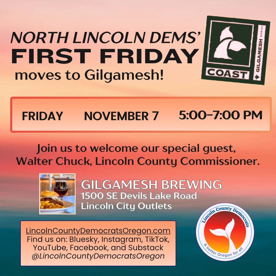 The North County Democrats will meet at Gilgamesh Brewing (located in the Lincoln City Outlets) on Friday, November 7.