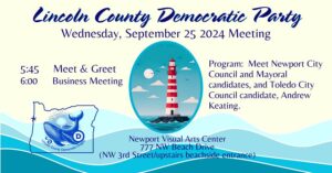 Do you want to meet the candidates? Buy a Harris Walz sign? Get involved in electing Democrats? Meet new Democrats? Then come to our Sept meeting in Newport, at the Visual Arts Center, 777 NW Beach Drive. Socialize 5:45, meeting 6pm.